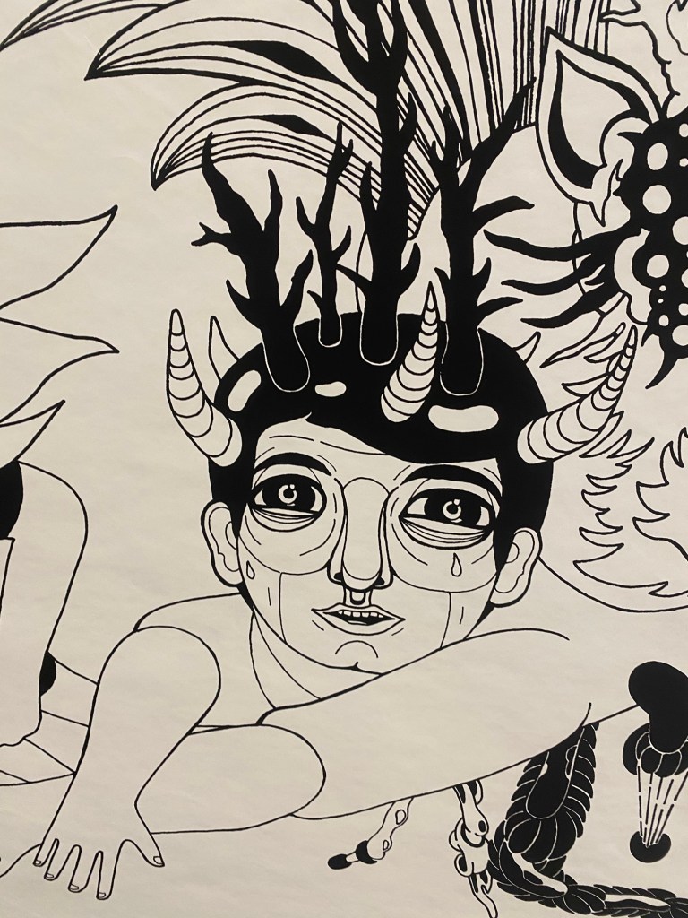 Within the framework of settler-colonialism, immigrants are placed under immense pressure to integrate and assimilate. How does one navigate this expectation while keeping oneself intact? Jongwook Park’s Breathing Words describes the patterns of linguistic and cultural migration for a Korean-Canadian settler. Biomorphic shapes and forms intermingle with Korean storytelling and myth. Transliterations of English and French words into Korean Hangul cascade playfully among grotesque figures with bulging eyes. Korean identity and history weave chaotically through letters and words, spilling down long scrolls of paper. Pottery, one of Korea’s treasured artistic mediums, gives corporeal form to these words, transforming them into globular, asymmetrical shapes. The irregularities of the vessels express the ever-changing formlessness of social integration into a nation without identity. Whimsy, passion, desperation, and joy pour out of Park’s figures as their grimacing faces lunge at the viewer. Park’s work functions as a guide through the transitional process of settlement and integration, while maintaining a sovereignty of self.